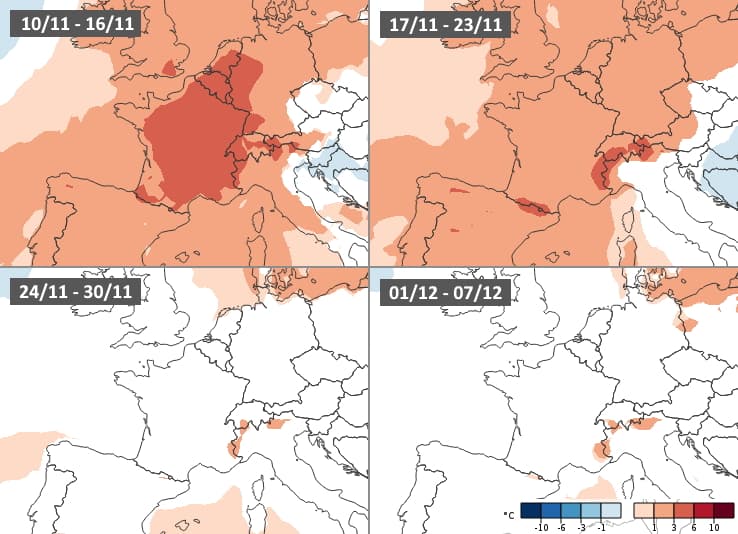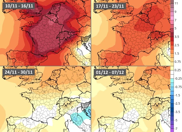 Comme l'illustre le modèle européen, nous sommes au coeur d'une semaine remarquablement douce pour la saison avec des excédents thermiques de +3 à +6°C. La douceur devrait rester très nette la semaine prochaine avant que nous retrouvions des valeurs plus proches des normales à la fin novembre et au début du mois de décembre.