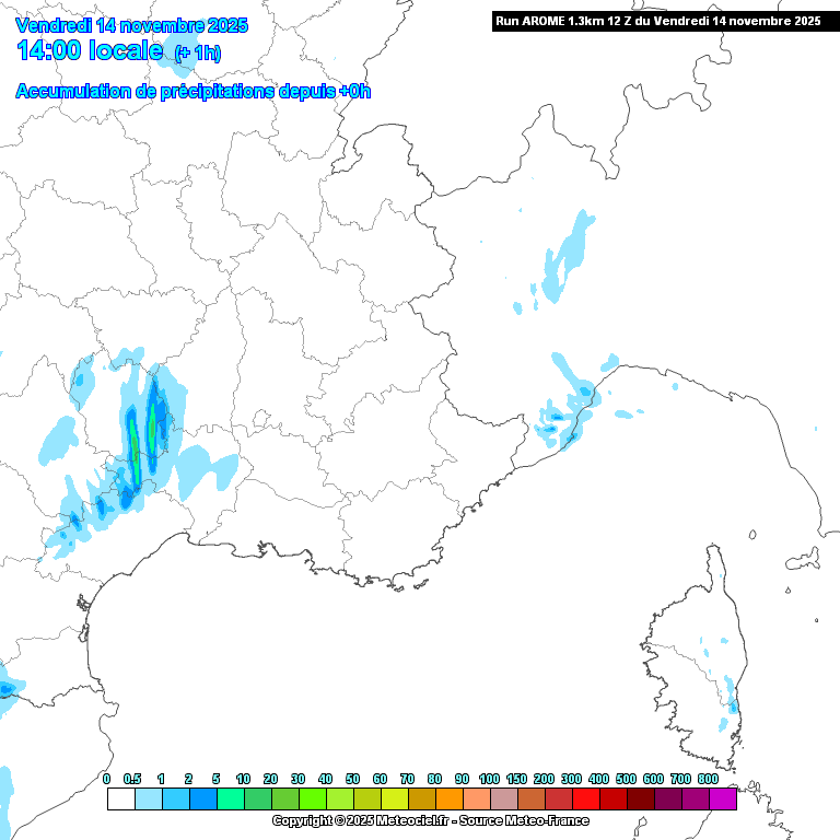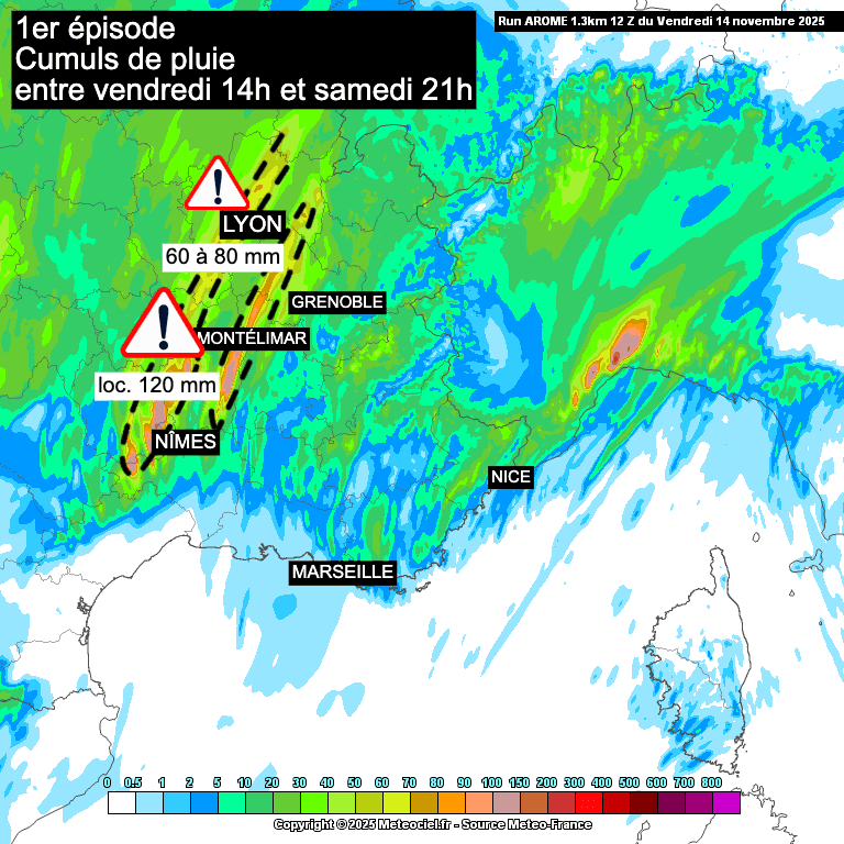 Compte tenu de la lente progression de cette dépression vers nos régions, les précipitations les plus intenses se produiront initialement entre les Cévennes et le Lyonnais, avant de se déplacer vers le sud des Alpes, tout en affectant de nouveau les Cévennes.