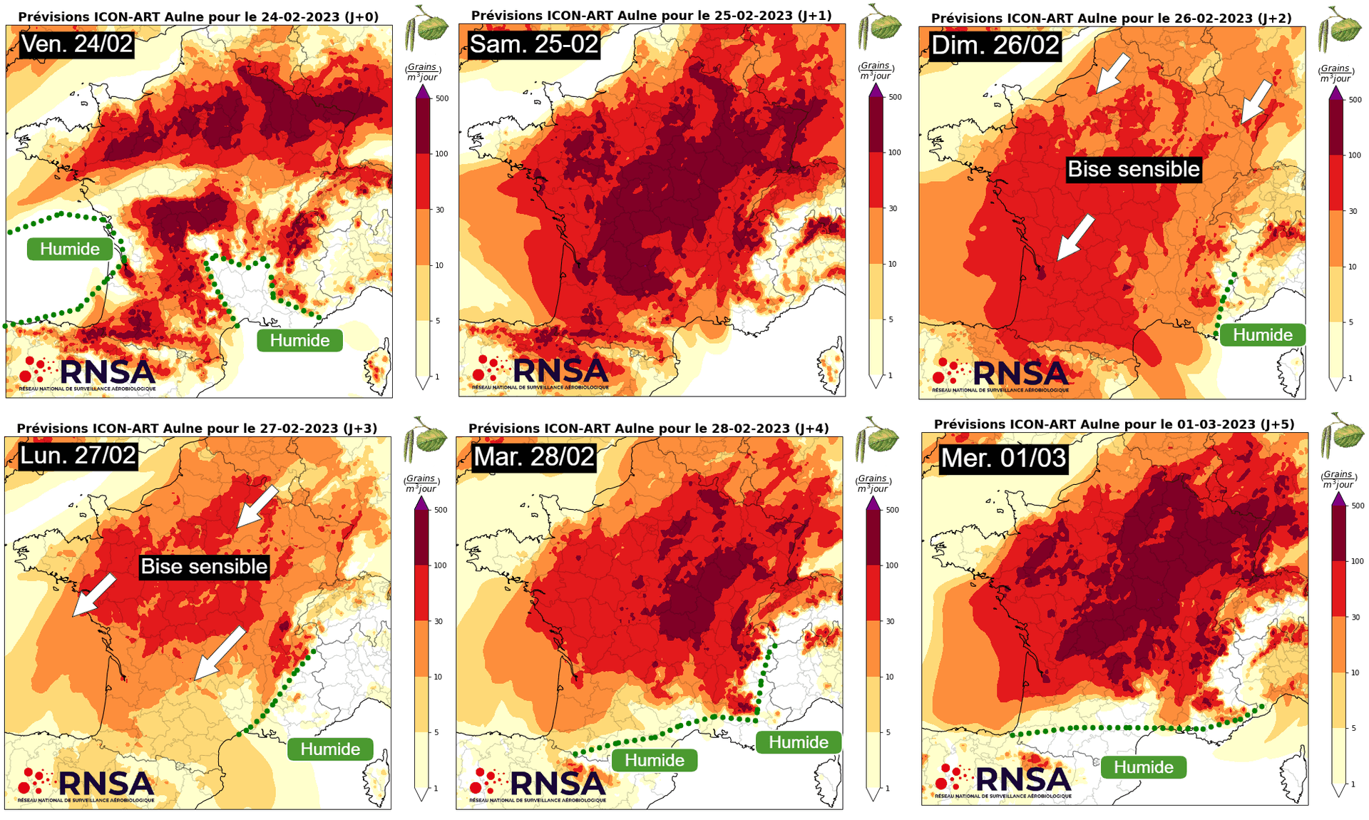 Evolution des concentrations en pollens d'Aulne dans l'atmosphère entre le 24 février et le 1er mars 2023 - RNSA