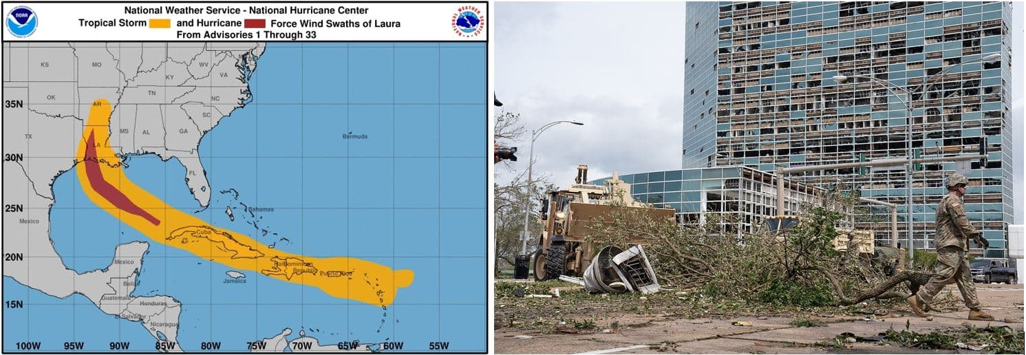 A gauche : Corridor de vents de tempête - NOAA - A droite : Bureaux à Lake Charles - Josiah Pugh