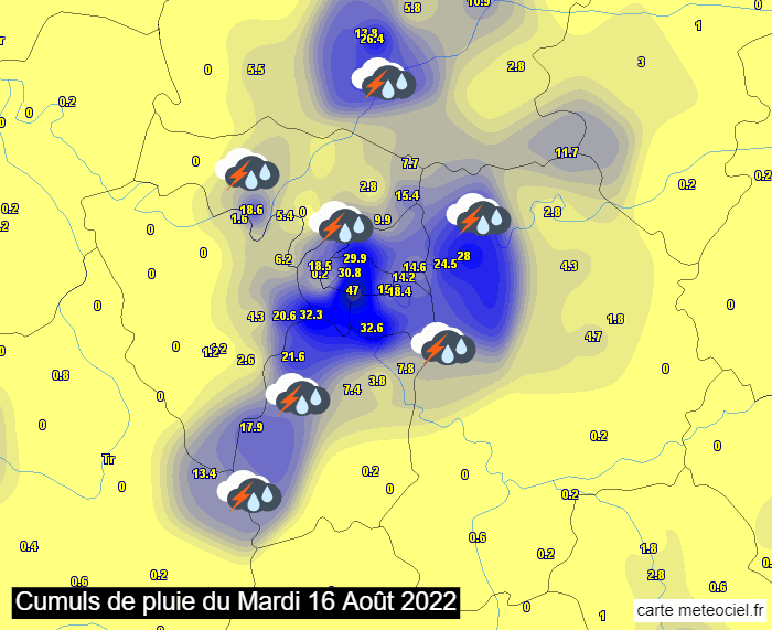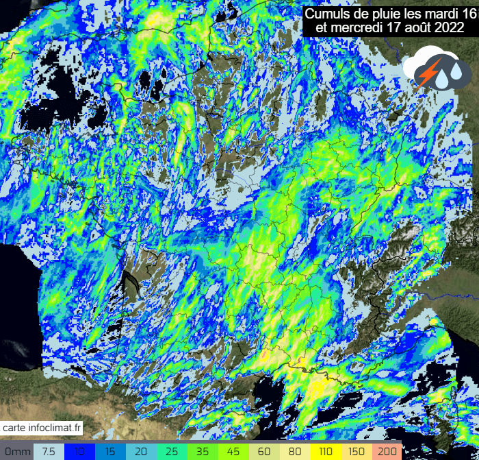 Cumuls de précipitations les mardi 16 et mercredi 17 août 2022 - via infoclimat.fr