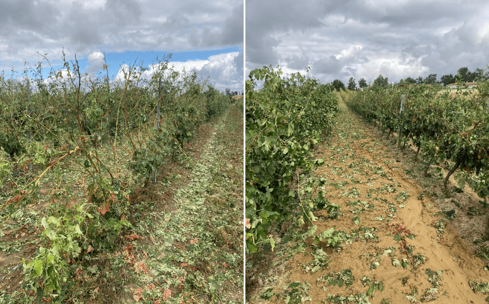 En fin de journée du mardi 16 août 2022, de violents orages ont éclaté dans le sud-ouest de la France, touchant notamment la région Midi-Pyrénées avant de se décaler en direction des Cévennes. Ils se sont accompagnés de chutes de grêle localement importants, ayant causé des dégâts majeurs dans les vignobles du nord du Gers. Comme le montre la photo ci-dessous, certains producteurs ont perdu une bonne partie de leurs récoltes dans le secteur de Condom.