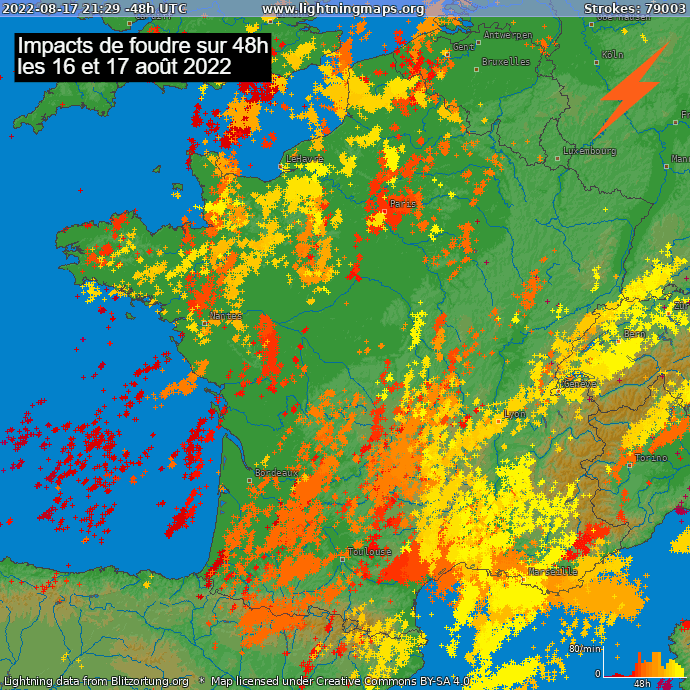 Comme le montre la carte ci-dessous, ce sont plus de 79.000 éclairs qui ont été détectés en France et à proximité du pays en l'espace de 48 heures les mardi 16 et mercredi 17 août 2022. Si les orages ont été généralisés du Languedoc à la côte d'Azur, ils furent plus désorganisés sur les autres régions. On a toutefois constaté une activité orageuse assez marquée du sud-ouest vers le Lyonnais en passant par l'Auvergne et sur le quart nord-ouest, de la Bretagne aux Hauts-de-France en incluant la région parisienne.