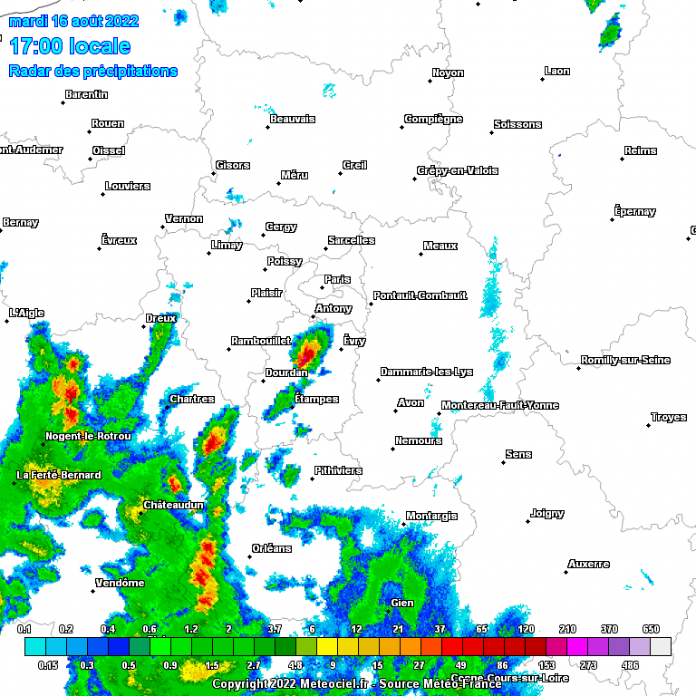 Images radar en Île-de-France le mardi 16 août 2022 de 17h à 19h45 - via meteociel.fr