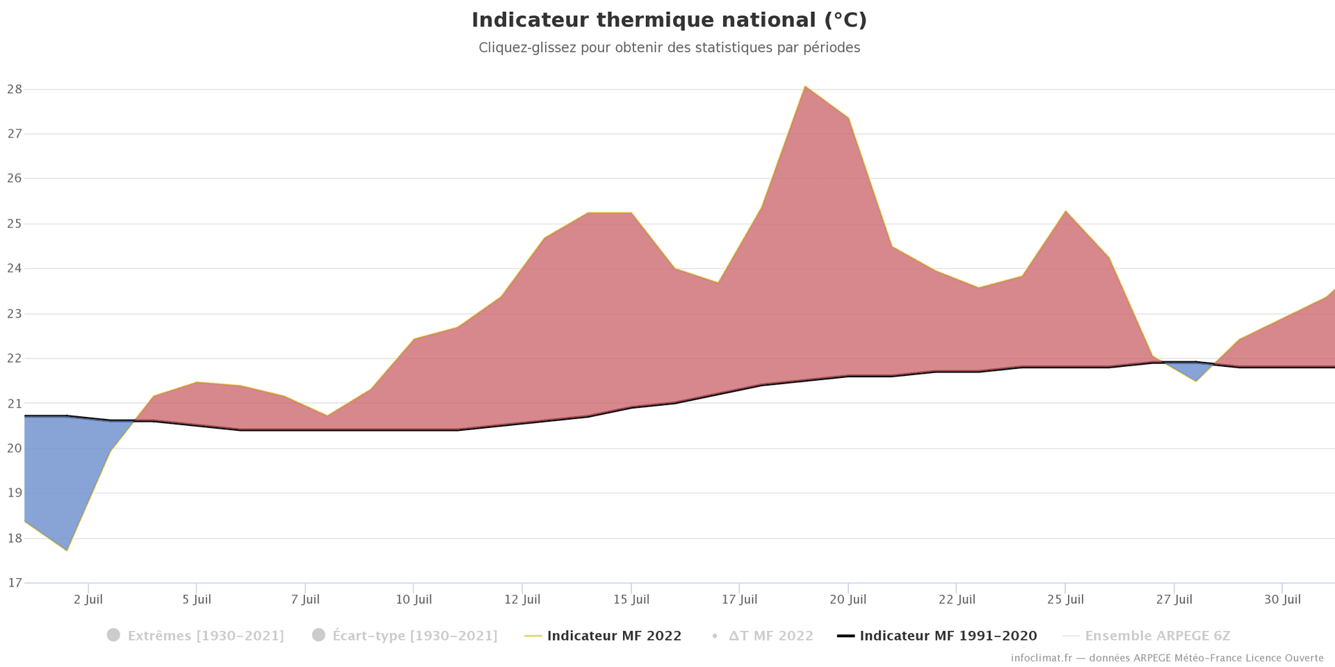 Température moyenne quotidienne en juillet 2022 en France - écart à la moyenne 1991-2020 - Infoclimat