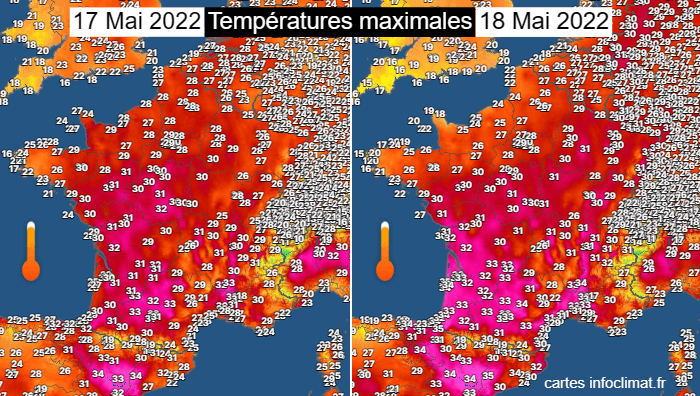 Températures maximales relevées les 17 et 18 mai 2022 - via infoclimat.fr