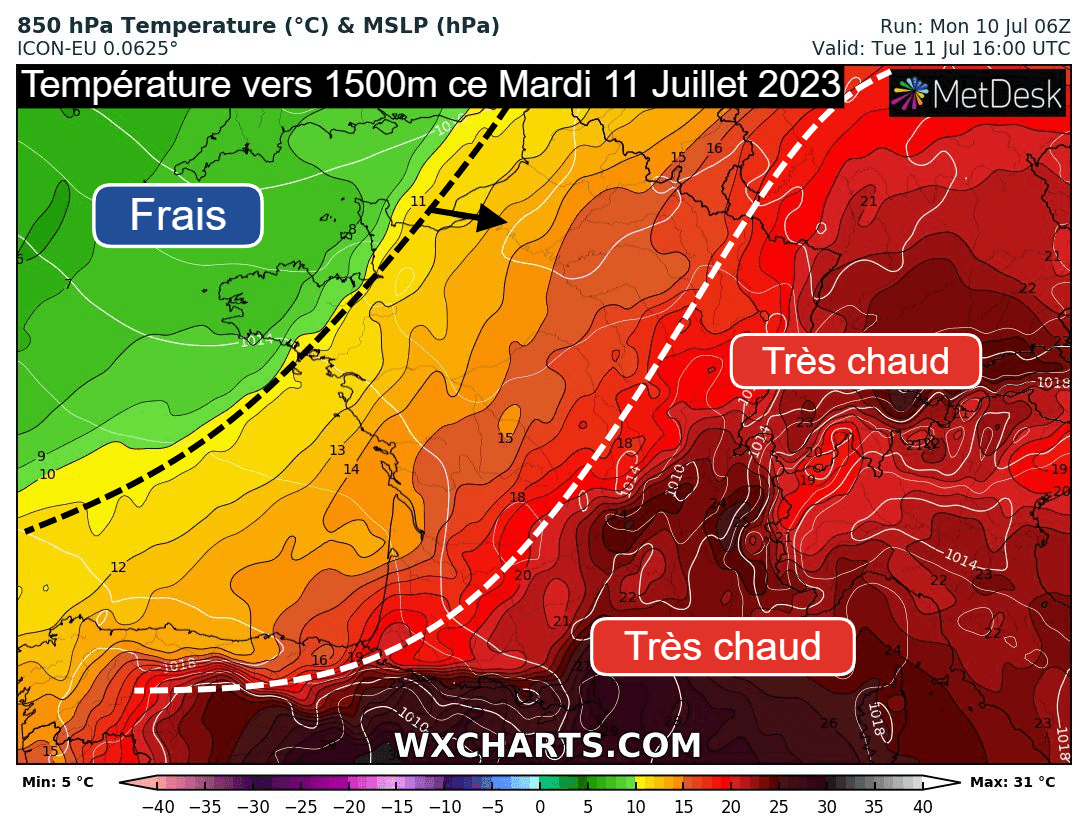 Un nouveau soulèvement d'air bouillant va gagner le nord-est de la France ce mardi 11 juillet 2023. Les températures à 850 hPa (vers 1500 mètres d'altitude) franchiront la barre des 20°C jusqu'en Alsace et pourront atteindre localement les 25°C dans le sud-est de la France ! Dans le même temps, l'air océanique nettement plus frais sera en embuscade par le nord-ouest avec moins de 10°C à 1500 mètres sur la pointe bretonne. C'est ce conflit de masses d'air qui autorisera des orages de très forte intensité en fin de journée.