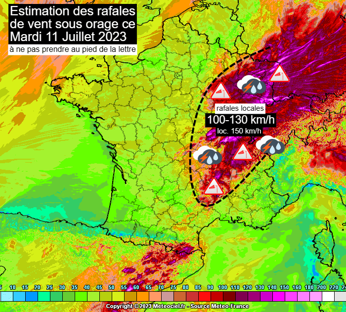 Rafales de vent envisagées par le modèle AROME ce mardi 11 juillet 2023 – via meteociel.fr