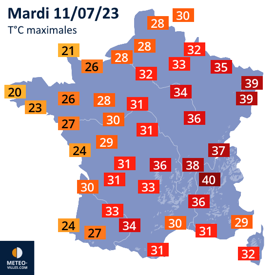 Températures maximales prévues ce mardi 11 juillet 2023 - Météo Villes