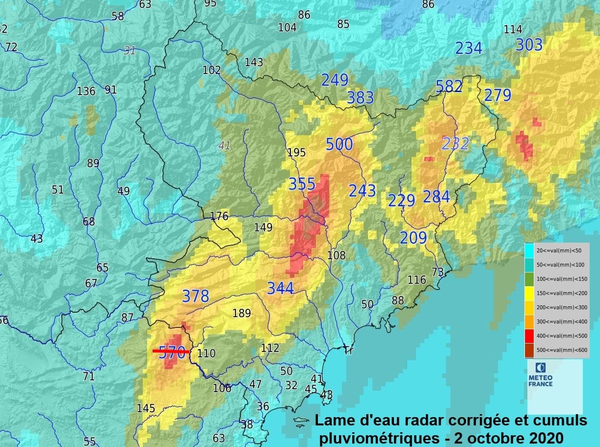 Les 570mm relevés à Mons (83) ont été largement surestimés en raison d’un mauvais réglage du pluviomètre, cette valeur doit être divisée par 2.5 pour obtenir un chiffre proche de la réalité (environ 230mm).