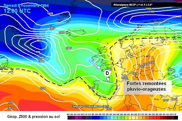 Réanalyse NCEP du 5 Novembre 1994 montrant une situation particulièrement favorables aux très fortes pluies sur le Sud-Est du pays - Via météociel.fr