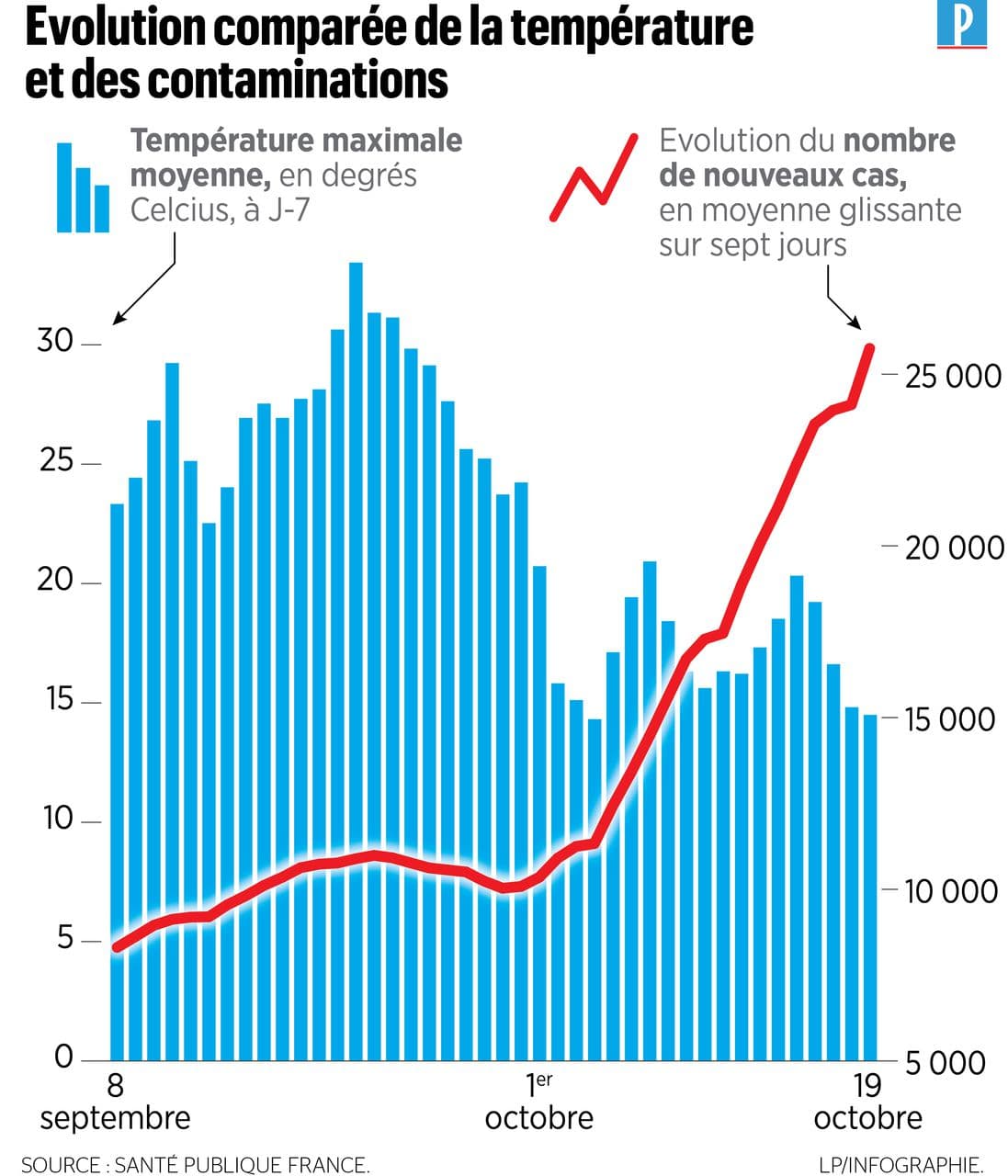 Corrélation entre l'augmentation du nombre de cas positifs et la baisse des températures moyennes sur le pays - Via LeParisien