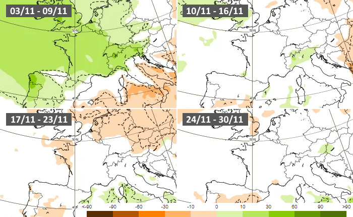Selon le modèle européen, la première décade du mois de novembre 2025 sera globalement humide en France. Même si quelques journées calmes sont prévues, les perturbations pluvieuses devraient être multiples au cours de cette dernière, concernant la plupart des régions. En revanche, le modèle mise sur un retrait de l'instabilité dès le début de la deuxième décade du mois et envisage même une petite anomalie sèche durant la seconde partie de novembre 2025. Les hautes pressions pourraient donc reprendre le dessus.