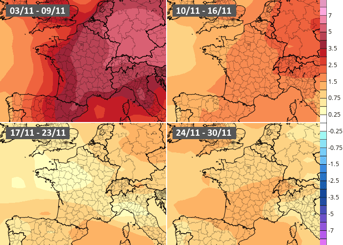 Côté thermomètre, le modèle européen mise sur une large domination de la douceur durant la première quinzaine du mois. La semaine du 3 au 9 novembre 2025 serait la plus douce, particulièrement dans le sud et l'est de la France où l'anomalie pourrait atteindre +4 à +5°C. En revanche, la douceur s'atténuerait en seconde quinzaine, notamment en raison d'une météo plus calme propice à des nuits devenant de plus en plus froides.