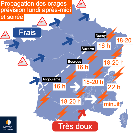 Prévision de propagation des orages pour lundi - carte Meteo-villes