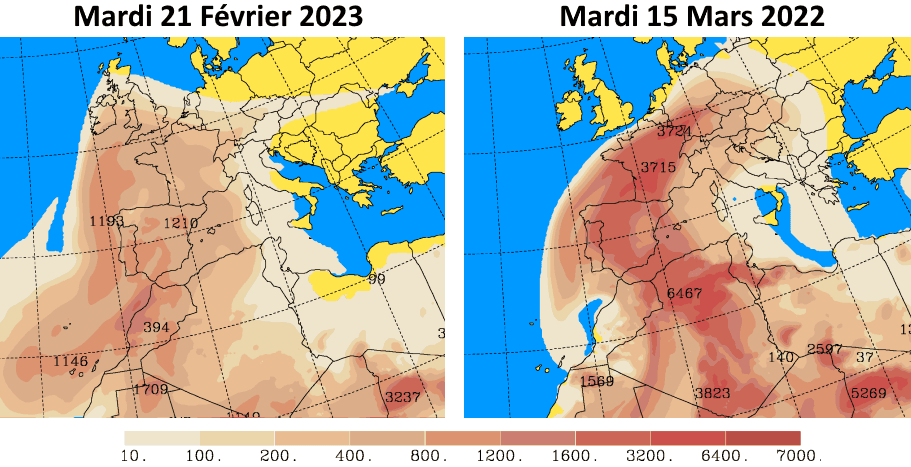 Comparaison des concentrations en sable entre le 21 février 2023 et le 15 mars 2022 - via SKIRON