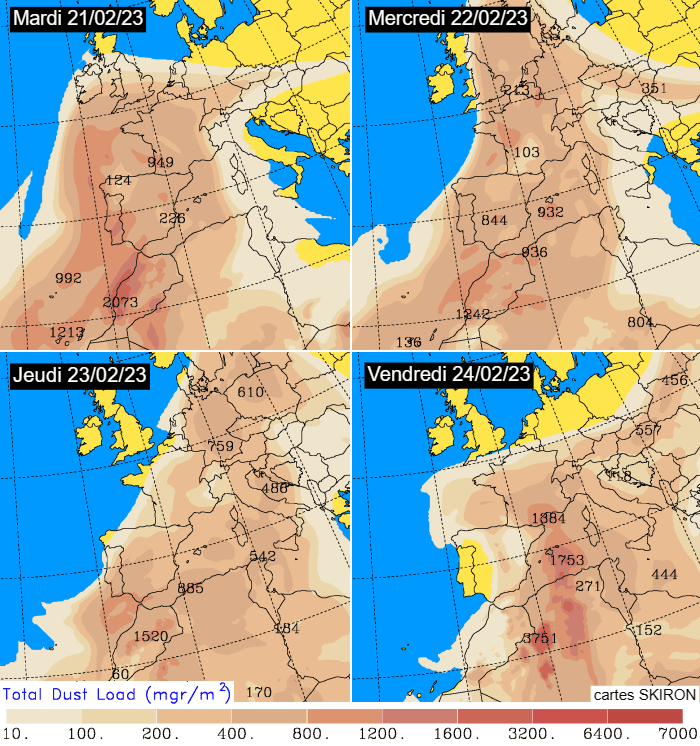 Prévisions de concentrations en sable du Sahara du mardi 21 au vendredi 24 février 2023 - via SKIRON