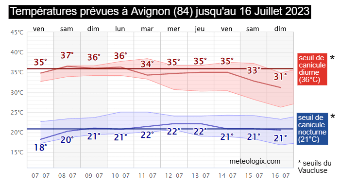 Ainsi, certains départements du quart sud-est vont flirter avec les seuils de canicule. Dans le Vaucluse, ils sont de 21°C la nuit et 36°C le jour. À Avignon, les valeurs attendues seront très proches de ces seuils dès le samedi 8 juillet et jusqu'au vendredi 14 juillet avec en général 20 à 22°C la nuit et 34 à 37°C le jour. Autant dire que le Vaucluse va flirter avec les seuils de canicule durant une semaine ! Par accumulation, cet épisode de fortes chaleurs s'annonce donc pénible sur le sud-est de la France.