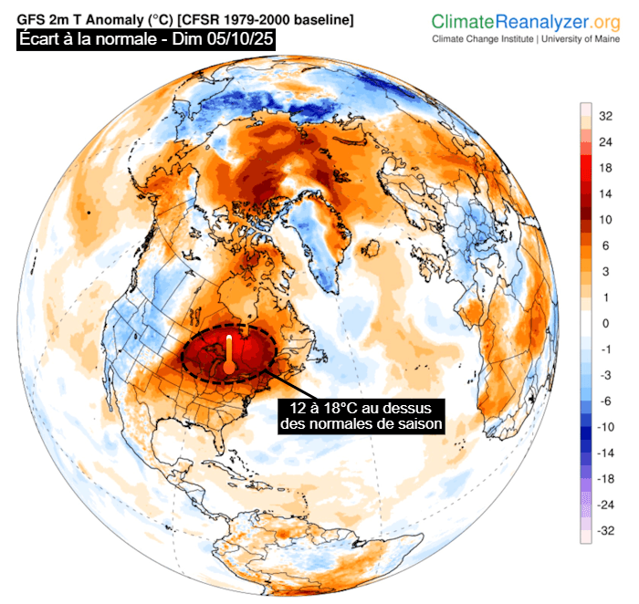 L'est du Canada et plus particulièrement les provinces du Québec et de l'Ontario sont en plein "été indien" ! Ce dimanche 5 octobre 2025, le thermomètre s'est envolé à des niveaux remarquablement élevés. En effet, l'écart aux moyennes de saison atteignait généralement +12 à +18°C sur ces zones, comme l'illustre la carte ci-dessous ! Même pour ces régions habituées aux montagnes russes thermiques en automne, une telle anomalie positive est remarquable.