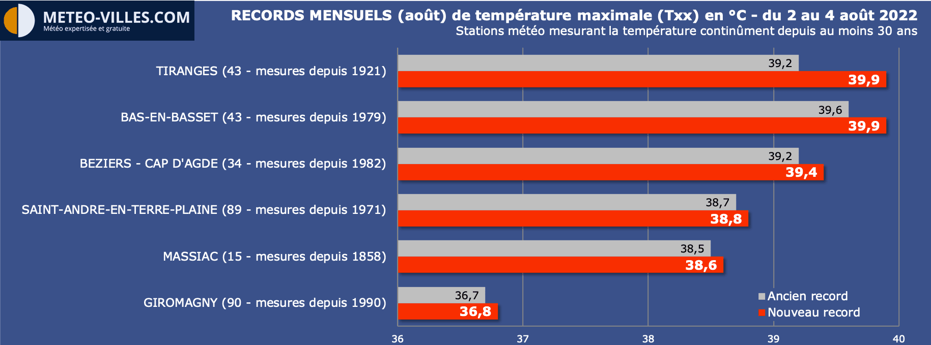 Records mensuels d'août de température maximale battus du 2 au 4 août 2022 - stations mesurant depuis au moins 30 ans - Météo-Villes