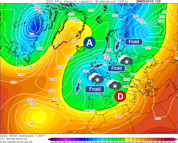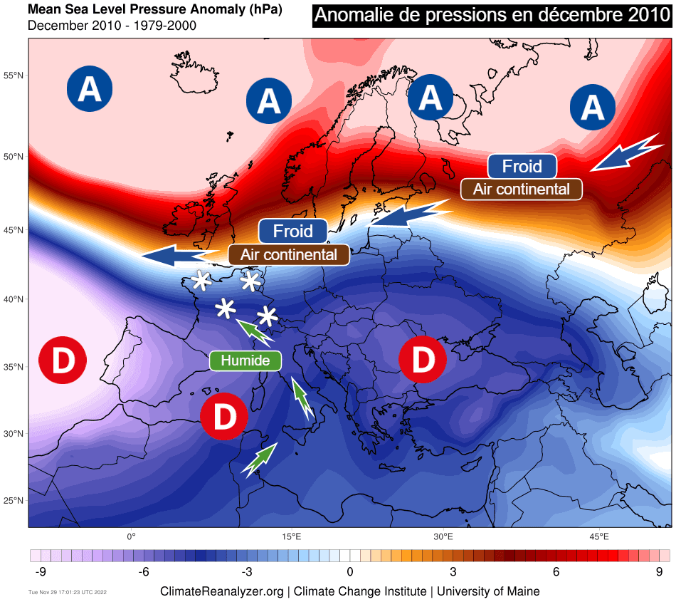 Mis en place dès la fin du mois de novembre 2010, le blocage anticyclonique aux hautes latitudes perdurera une bonne partie du mois de décembre 2010. Avec des hautes pressions très puissantes de la Russie au Groenland, les dépressions ont circulé des Açores aux Balkans en passant par le bassin méditerranéen, dirigeant un flux continental froid sur une grande partie de l'Europe. Outre les averses de neige venues du nord, plusieurs fronts sont également remonté par la Méditerranée ai gré du passage des anomalies dépressionnaires et ont donné lieu à d'importants conflits pluvio-neigeux sur notre pays.
