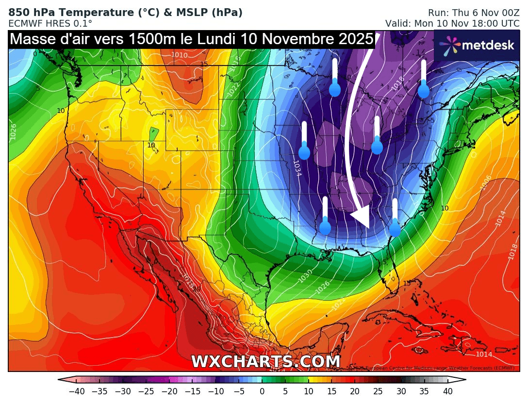Masse d'air à 850 hPa (vers 1500m) prévue aux USA le lundi 10 novembre 2025 - wxcharts.com