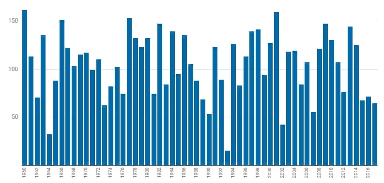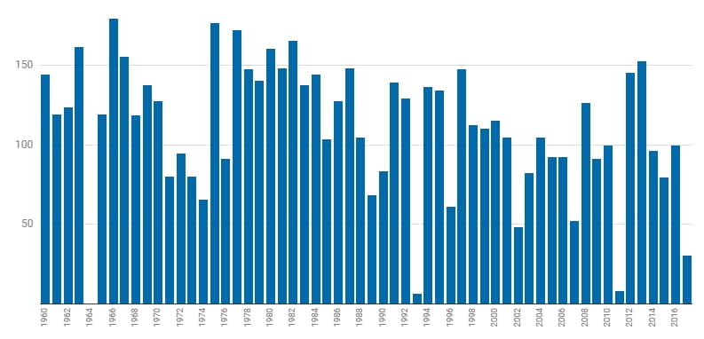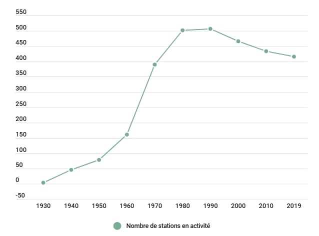 Nombre de stations de ski en activité en France depuis 1930 - via Slate