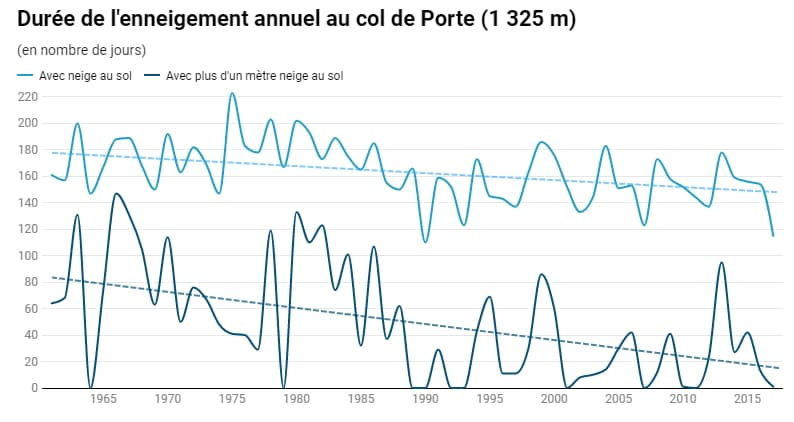 Durée annuelle avec présence de neige au sol (et couche de plus d'1m) au col de Porte en Isère - via France Info