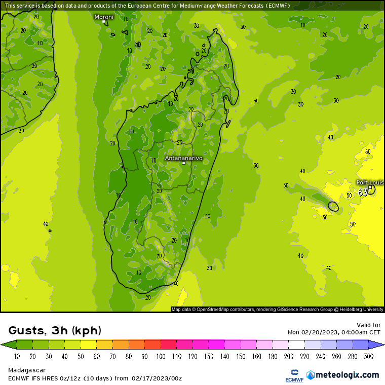 Celui-ci devrait également circuler à peine au Nord Nord de la Réunion entre lundi 20 et mardi 21 avant d'atteindre la côte malgache. Si cette région ne sera pas directement touchée par la partie la plus active du cyclone, ses effets devraient toutefois être bien sentis entre la Réunion et l'île Maurice avec des vents pouvant dépasser les 100km/h (notamment sur la partie Nord de ces îles), une houle de plus de 8m et des précipitations diluviennes laissant craindre des inondations locales.