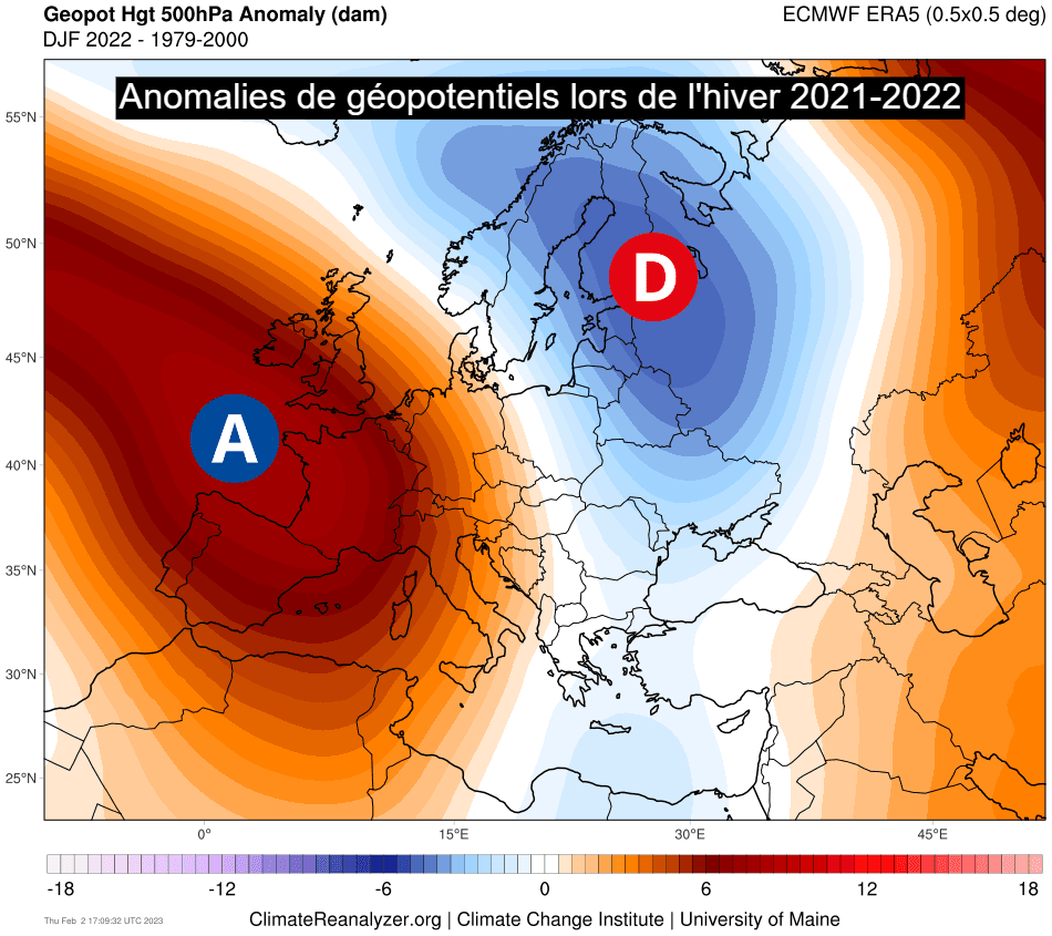 Anomalies de géopotentiels en Europe lors de l'hiver 2021-2022 - via climatereanalyzer.org
