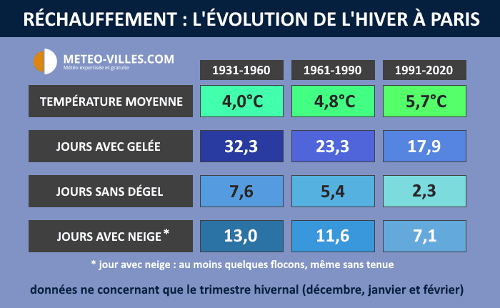 D'une manière générale, l'hiver parisien du XXIème siècle ne ressemble plus à l'hiver parisien du siècle dernier. Entre la période 1931-1960 et la période 1991-2020, la température moyenne du trimestre hivernal a augmenté de 1,7°C à Paris, passant de 4,0°C à 5,7°C ! Des quatre saisons, l'hiver est la saison qui s'est le plus réchauffée. Sur cette même période, le nombre moyen de jours de gel durant l'hiver a chuté de 32,3 jours à 17,9 jours et les jours sans dégel sont devenus rares (2,3 en moyenne). Depuis le milieu du siècle dernier, Paris a perdu un peu moins de la moitié de ses jours avec observation de flocons de neige (d'une moyenne de 13,0 jours à 7,1 jours).