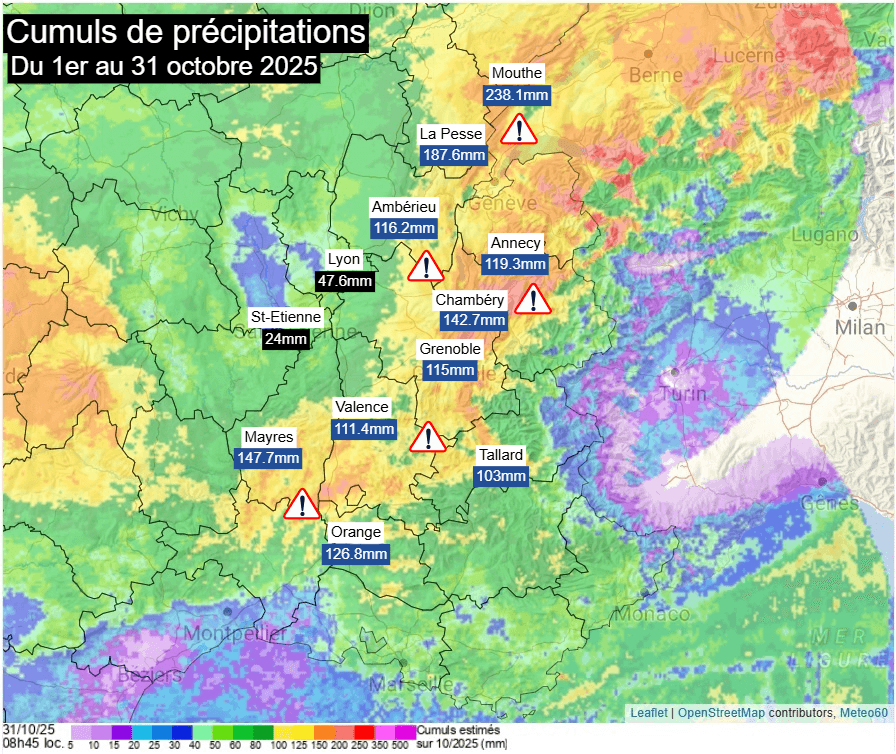 Dans tous les cas, il conviendra de surveiller l'intensité des précipitations sur ces régions. Le centre-est du pays a subi des épisodes pluvieux successifs et parfois marqués ces deux dernières semaines et les cumuls depuis le début du mois sont parfois notables, notamment entre les Cévennes et le nord des Alpes. Des réactions de cours d'eau pourraient ainsi être observées localement.