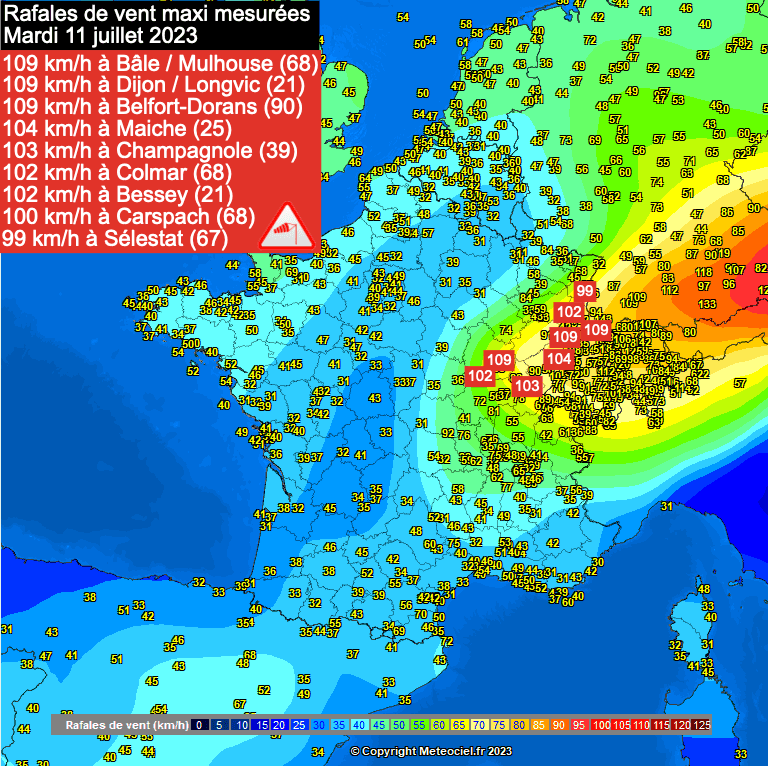 Rafales de vent mesurées sous les orages du mardi 11 juillet 2023 – via meteociel.fr