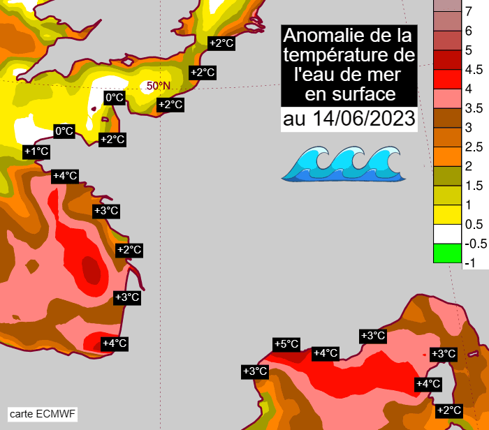 Pour bien se rendre compte du caractère anormal de ces températures de l'eau, la carte ci-dessous montre l'écart des valeurs actuelles par rapport à celles que nous devrions observer un 14 juin. Si l'anomalie est modeste en Manche et Mer du Nord (0 à +2°C), elle est nettement plus importante sur l'arc atlantique. On atteint un excédent de 4°C sur la côte sud de la Bretagne et la côte basque ! En Méditerranée, l'anomalie est souvent de +3 à +4°C et grimpe même à +5°C sur les rivages du Languedoc !