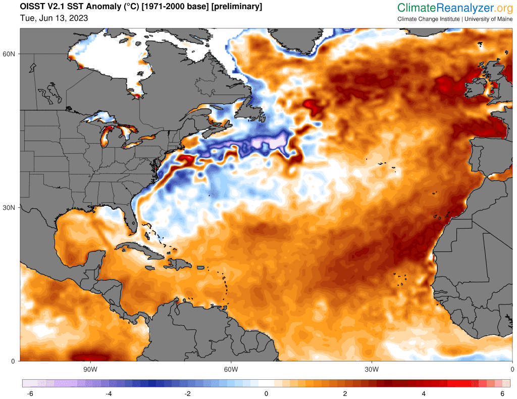 Anomalie de la température de l'eau de mer en surface sur l'Atlantique au mardi 13 juin 2023 - via climatereanalyzer.org