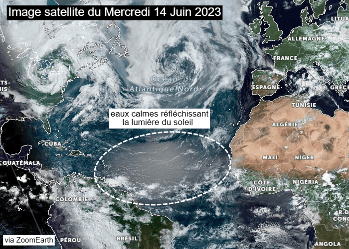 Comme l'anticyclone subtropical est nettement moins puissant qu'en temps normal, les alizés soufflent peu et il n'y a quasiment pas de sable dans l'atmosphère. Le soleil peut donc efficacement réchauffer les eaux en surface, qui ne sont que peu brassées par la houle. D'ailleurs, l'image satellite ci-dessous en témoigne. En après-midi du mercredi 14 juin 2023, on pouvait observer une vaste tâche claire dans les eaux subtropicales de l'Atlantique. La houle étant particulièrement faible du fait de l'absence d'alizés, la surface de l'océan s'apparente presque à un lac. Or, des eaux calmes réfléchissent beaucoup plus la lumière que des eaux houleuses. C'est pourquoi le satellite laissait apparaître cette imposante tâche lumineuse !