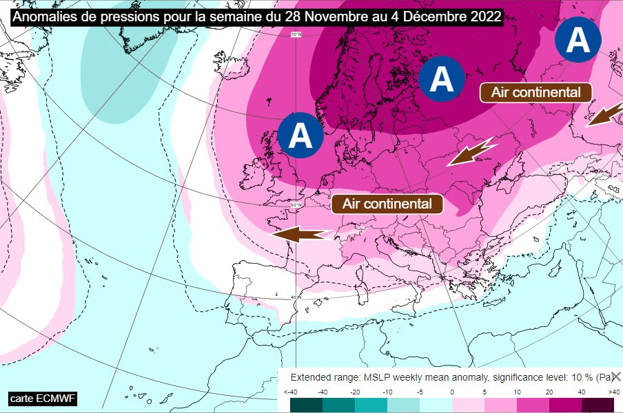 Anomalie de pressions modélisées entre le 28 novembre et le 4 décembre 2022 - via ECMWF