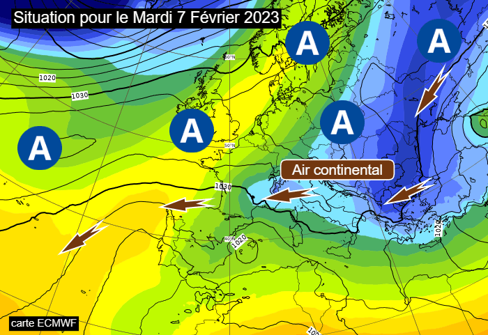Situation à échelle continentale pour le mardi 7 février 2023 - via ECMWF