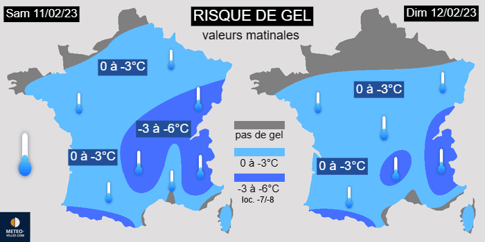 Les gelées resteront nombreuses au cours du week-end des samedi 11 et dimanche 12 février 2023, bien qu'elles pourraient épargner les régions les plus au nord (débordements nuageux) et certains rivages méditerranéens. C'est vers les reliefs et notamment du Massif Central aux frontières de l'est que le gel devrait être le plus marqué avec régulièrement -3 à -6°C.