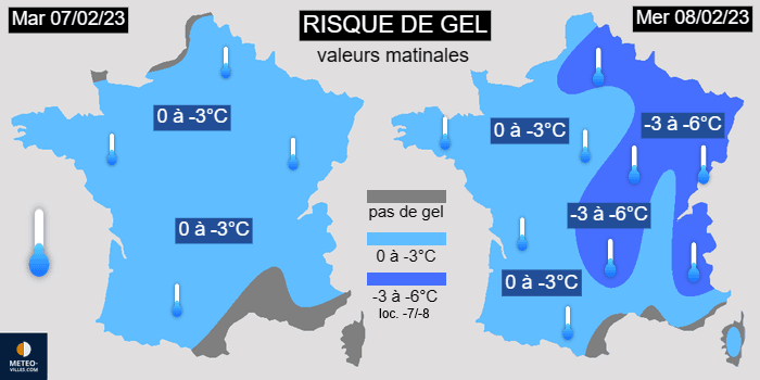 Le risque de gel s'étendra à la plupart des régions françaises à compter de la matinée du mardi 7 février 2023. En règle générale, les gelées resteront faibles avec 0 à -3°C pour les valeurs les plus basses. Les régions méditerranéennes ne seront pas concernées. Ce risque s'affirmera en matinée du mercredi 8 février avec 0 à -3°C en moyenne dans le sud et l'ouest du territoire mais régulièrement -3 à -6°C du Massif Central aux frontières du nord et de l'est. Notons que le gel s'observera jusque dans certains départements méditerranéens.