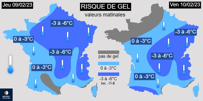 C'est la matinée du jeudi 9 février 2023 qui s'annonce comme la plus froide de la semaine. Il gèlera presque partout, à l'exception de la côte d'Azur et du domaine de l'autan. Il fera souvent 0 à -3°C dans l'ouest mais régulièrement -3 à -6°C dans le nord, le centre et l'est (localement -7 à -8°C dans les localités traditionnellement les plus froides). En matinée du vendredi 10 février, des nuages pourraient épargner le gel aux régions bordant la Manche. Ce dernier s'étendra jusqu'à la Méditerranée mais c'est entre le centre et l'est qu'il fera le plus froid avec souvent -3 à -6°C.