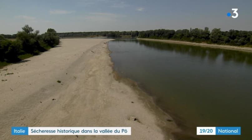 Le Pô subit la sécheresse et affiche un niveau historiquement bas début juillet 2022 - via France 3