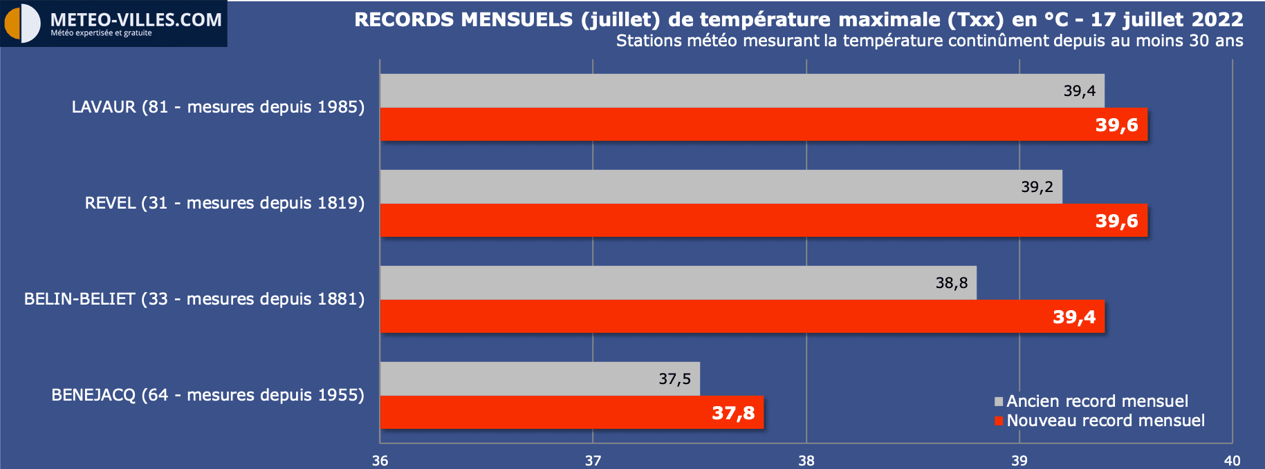 Parmi les stations mesurant depuis plus de 30 ans, 4 d'entre-elles ont encore battu leur record de chaleur pour un mois de juillet ce dimanche. Pour Revel (Haute-Garonne), il s'agit de la 2e journée consécutive : 39.6°C aujourd'hui, après les 39.2°C de samedi, contre un ancien record de 39.0°C (mesures depuis le 19e siècle).