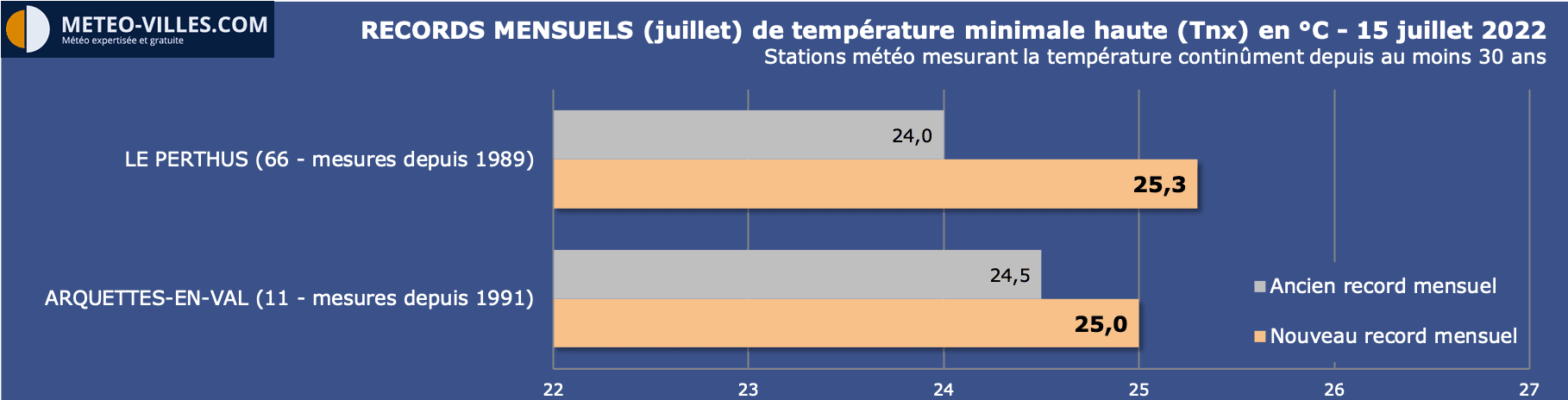 - 22.8°C à Peyrusse-Grande (32), battant les 22°C du 31 juillet 2020 (station ouverte en 1985)