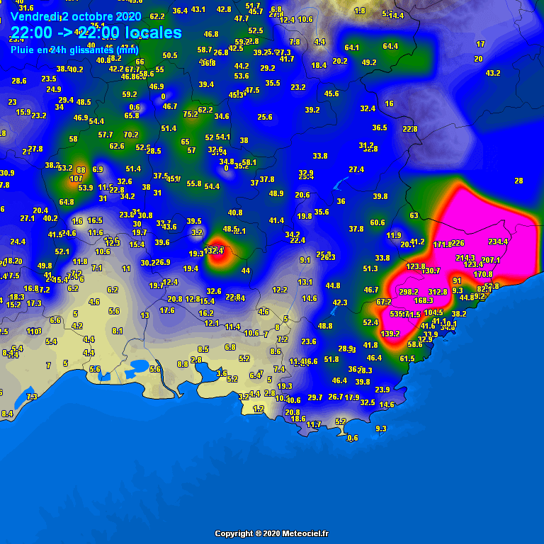 Cumuls de pluie (provisoires) exceptionnels en 24h ce Vendredi 02 Octobre entre l'Est Var et les Alpes-Maritimes - Via Météociel.fr