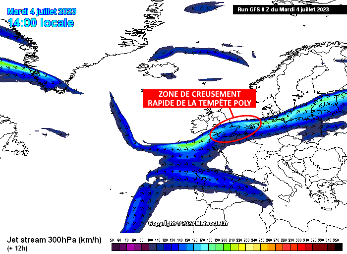 Courant jet (vent en haute altitude) ce mardi 4 juillet 2023 - via meteociel.fr
