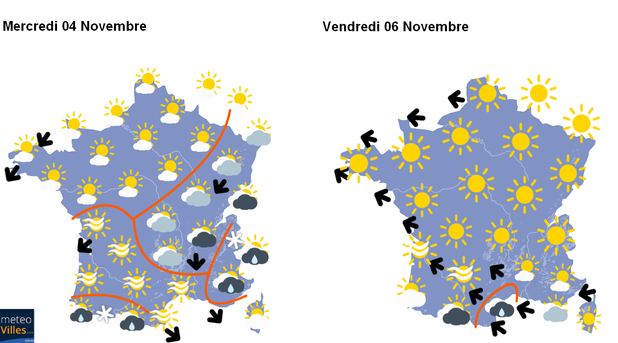 Temps prévu entre Mercredi 04 et Vendredi 06 Novembre en France - Météo-Villes