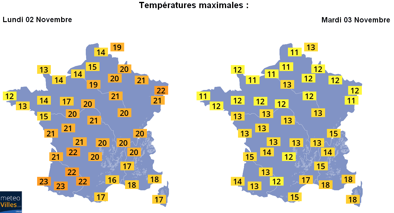Températures maximales prévues en France entre le Lundi 02 novembre et le Mardi 03 Novembre - Météo-Villes