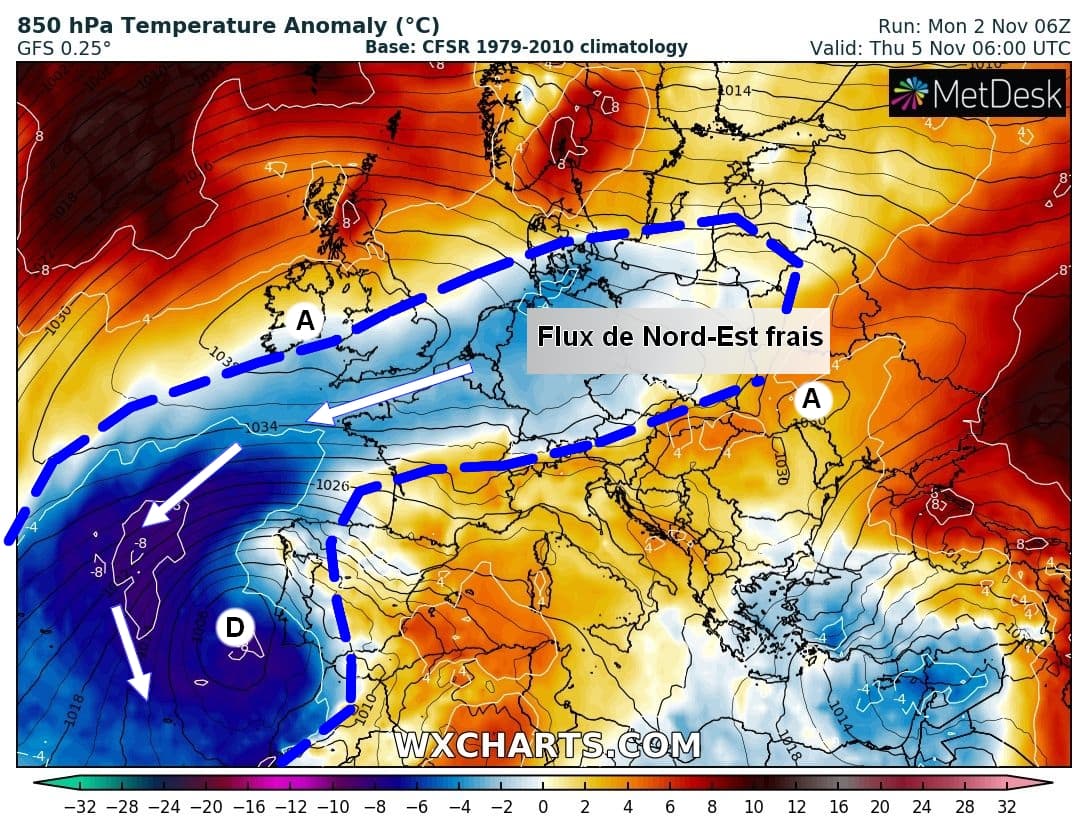 Cependant la douceur ne sera pas de retour pour autant avec des températures maximales vraiment fraîches durant cette période et ce malgré le soleil. Une dépression s’isole en effet dans les prochains jours sur le Sud-Ouest de l’Espagne, entraînant la mise en place d’un flux d’Est/Nord-Est frais sur de nombreuses régions.