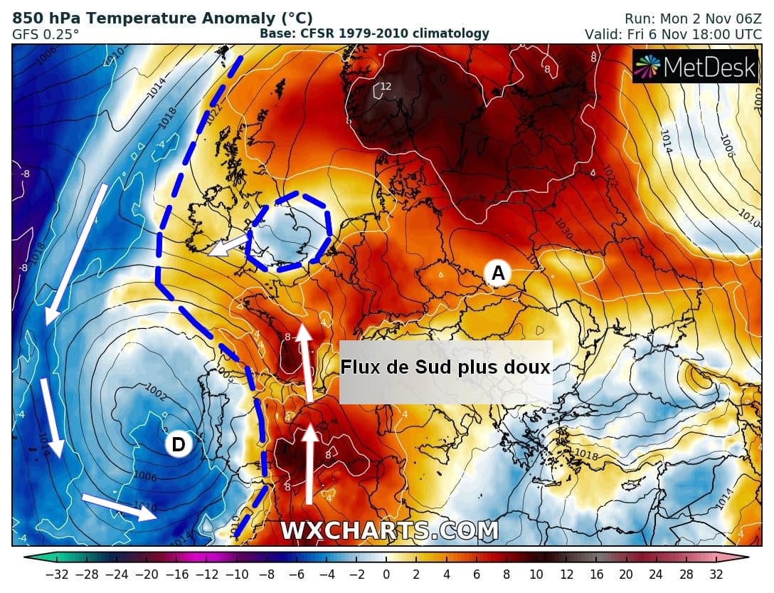 Anomalies de températures à 850hPa et isobares sur l'Ouest de l'Europe le Vendredi 06 Novembre - Modèle GFS via WX CHARTS